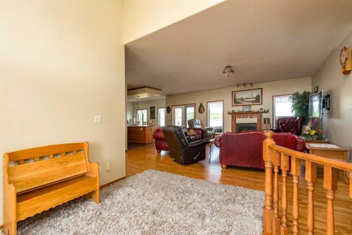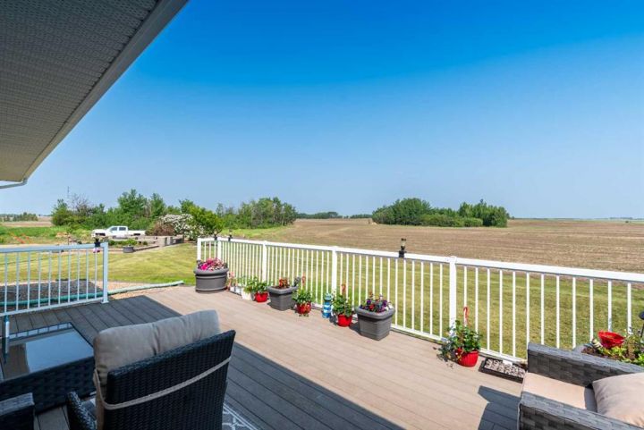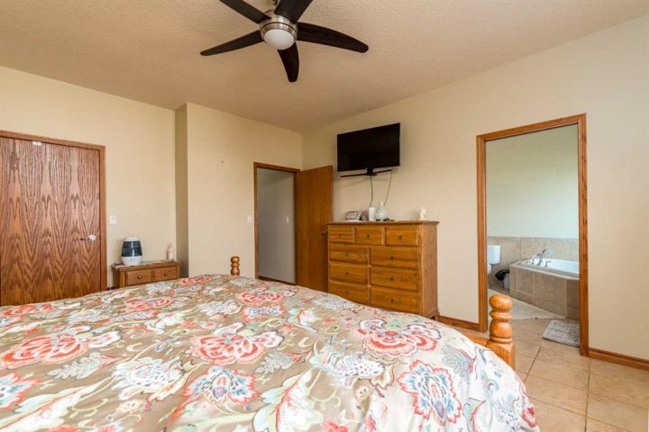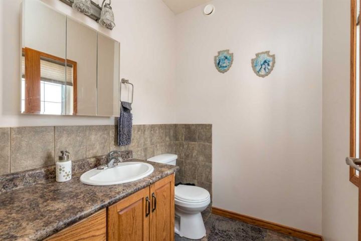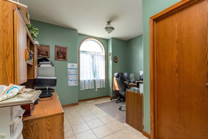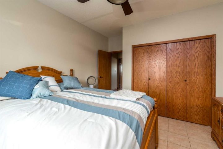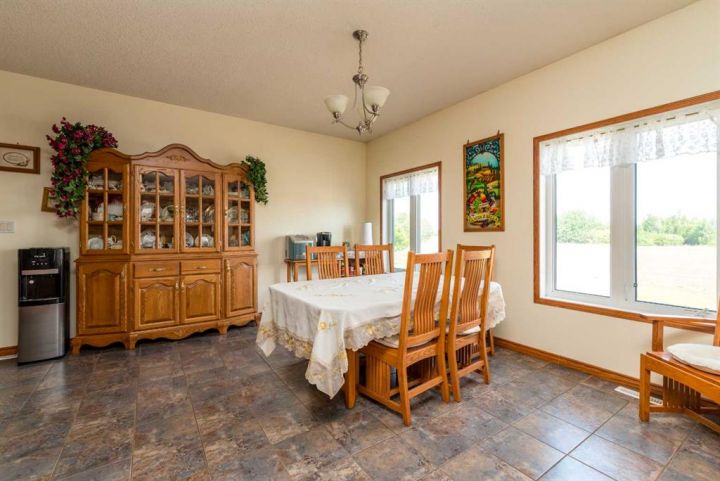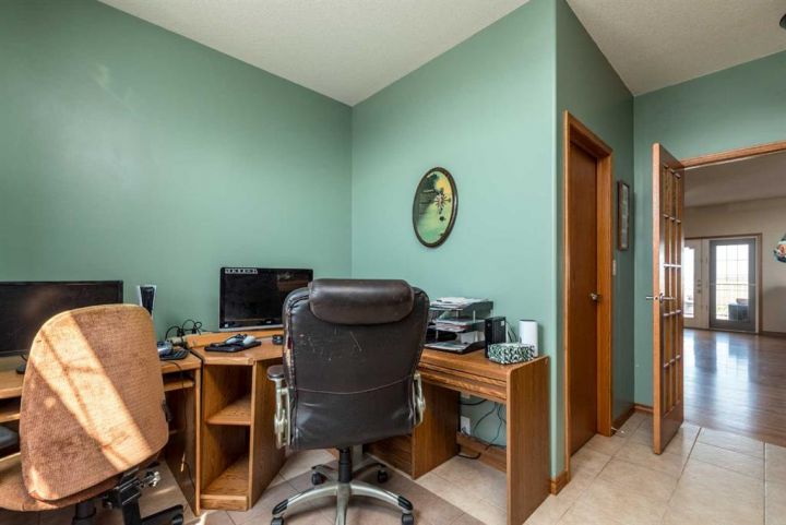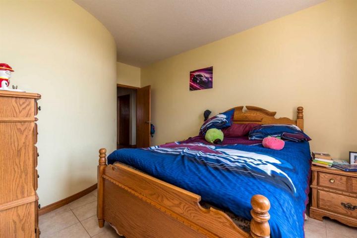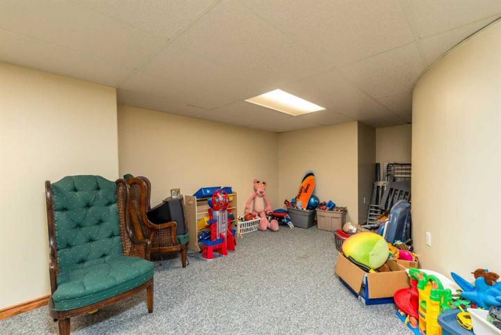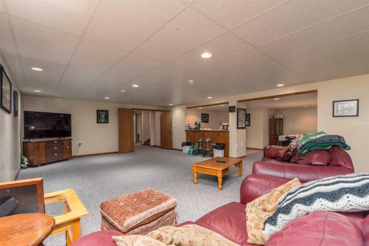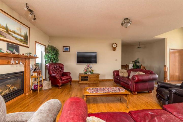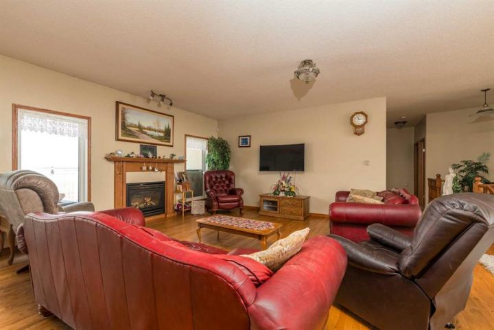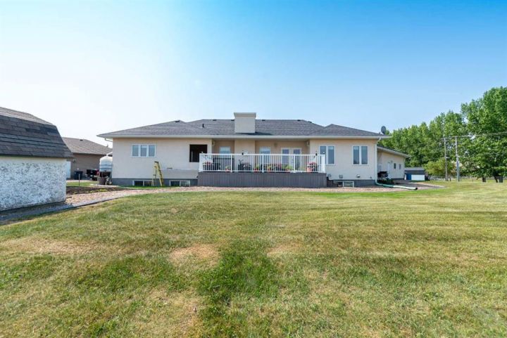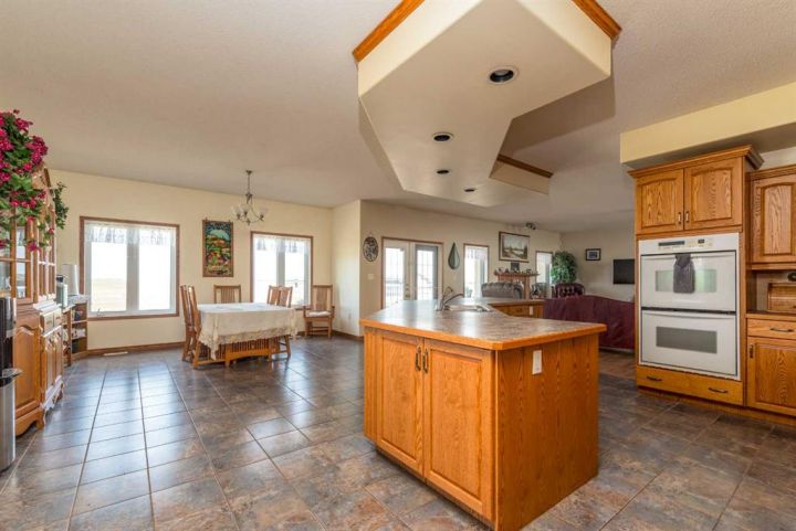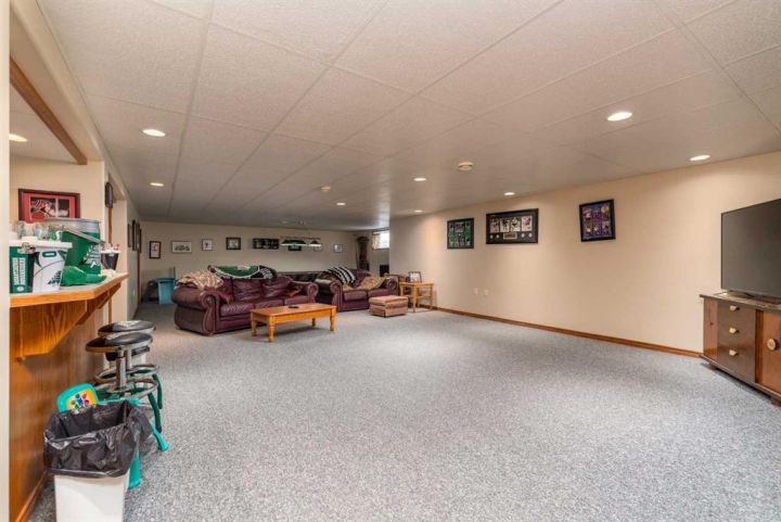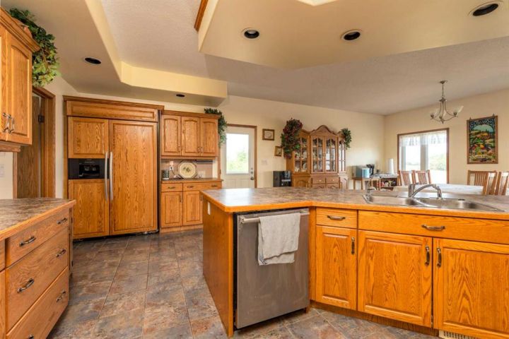 Step into timeless elegance with this meticulously crafted 2400 sq ft bungalow, built in 2006 and nestled on a quiet cul-de-sac. Positioned on two spacious lots and backing onto an open field, this home offers both privacy and scenic views. Upon entry, you're greeted by a covered foyer leading into an expansive, light-filled living area. The oversized living room is the perfect gathering space, complete with a cozy gas fireplace and a striking spiral staircase that descends to the entertainment-rich lower level. At the heart of the home lies a chef’s dream—an oak kitchen with a massive center island, double wall oven, countertop range, and a large walk-in pantry. The main floor also boasts three generous bedrooms, a dedicated office, and 2.5 well-appointed bathrooms for optimal convenience. The fully developed basement is designed with entertaining in mind. It features a 38x39 family room, two additional bedrooms, a full bath, and an expansive bar area ideal for hosting friends and family. The attached 24x36 heated double garage is a standout feature, offering epoxy floors, in-floor heating, a mudroom, and plenty of storage space—including room for all your hockey gear. Additional highlights include geothermal heating and cooling with a backup system, and in-floor heating in the garage, basement, and all tiled areas upstairs for year-round comfort. Practicality meets luxury with an extra utility/laundry room off the kitchen and a beautifully landscaped backyard oasis. Enjoy evenings around the custom firepit, cultivate your green thumb in the large garden, or store tools in the included shed. RV parking is available on the west side of the lot—perfect for adventurers. This home is move-in ready with all appliances and wall-mounted TVs included. While the reverse osmosis system and water softener are currently disconnected, the property benefits from Maidstone’s new water system. This exceptional bungalow blends spacious design, modern amenities, and luxurious comfort—an absolute must-see.