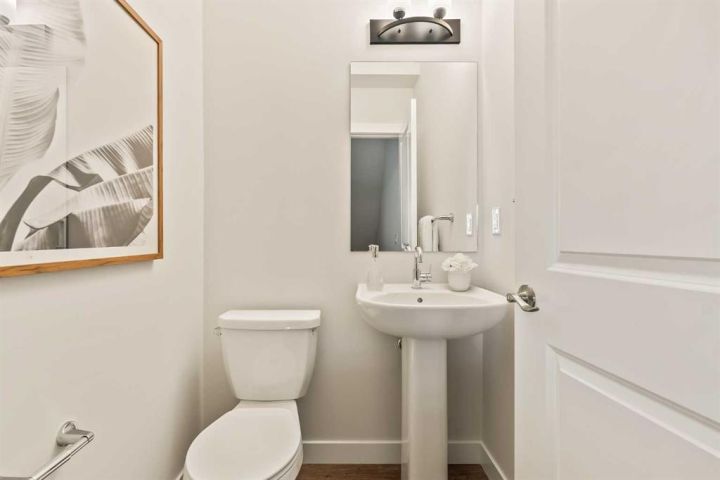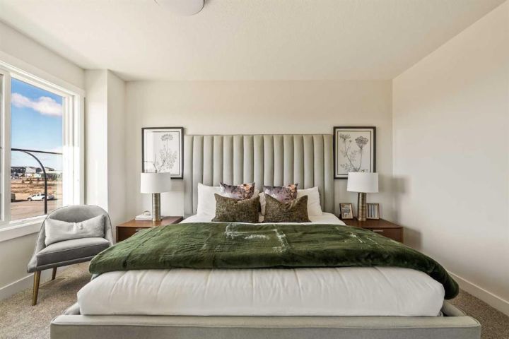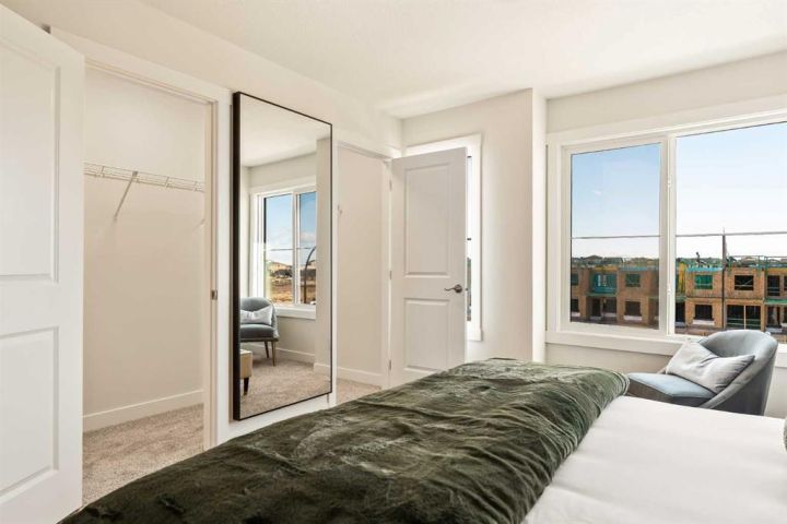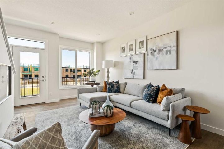 Open House - Saturday Nov 29 and Sunday Nov 30 12pm-5pm. Welcome to the brand-new Rhythm townhomes at Taza Park by Brookfield Residential, offering an ultimate low-maintenance lifestyle ideal for first-time buyers, downsizers, or those seeking a convenient lock-and-leave home. This bright and modern ‘Geranium’ model features an intelligently designed open-concept layout with 2 bedrooms, 2.5 bathrooms, and a double-attached garage, providing over 1,100 sq. ft. of beautifully appointed living space. The spacious main level is filled with natural light thanks to oversized windows and an open layout perfect for entertaining. The upgraded kitchen showcases full-height cabinetry, stainless-steel appliances including a range hood and built-in microwave, a French-door refrigerator, a large peninsula with seating, and a corner pantry. The adjacent dining area flows effortlessly into the inviting front living room, where doors lead to a private southwest-facing balcony. Completing this level is a convenient 2-piece powder room. Upstairs, you’ll find dual primary suites, each with generous closets and private ensuites, an ideal layout for guests, roommates, or a dedicated home office setup. A centrally located laundry space adds everyday convenience. The tandem double-attached garage offers secure parking plus additional storage space, ensuring comfort and practicality year-round. Additional upgrades include enhanced railing details, a natural gas BBQ line, and a 3-year extended workmanship warranty for peace of mind. Legal fees are included, and a complimentary move-in concierge service with Virtuo ensures a seamless move-in experience. Situated just minutes from Weaselhead Park, the Glenmore Reservoir, and major commuter routes, Rhythm at Taza Park delivers the perfect blend of nature access and urban convenience. This is a rare opportunity to own a brand-new contemporary townhome in a coveted location, book your showing today! *Please note: photos are of a show home model and exact finishes will vary.