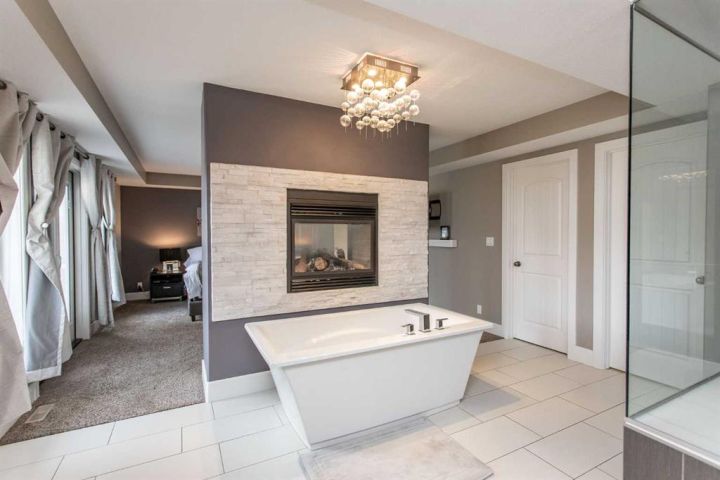 Upstairs, a cozy bonus room overlooks the main level, creating a loft-like feel. The primary suite is a true retreat, featuring its own fireplace, patio doors to a private balcony, and a luxurious ensuite with a deep soaker tub, glass shower, dual sinks, and a large walk-in closet. Two additional bedrooms share a stylish Jack-and-Jill bathroom with dual sinks and a separate tub and toilet area.
