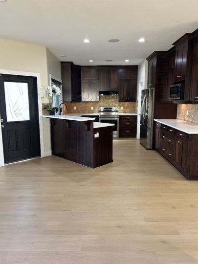 Designed with both function and family fun in mind, this exceptional home offers an ideal blend of comfort, space, and style. All new quartz through out the home with brand new undermount sinks, new faucet in the kitchen. New flooring on main level and by second kitchen on the lower level. Laundry room on second level for easy access. Featuring a sunroom, mudroom, over 550 sq. ft. of outdoor decking, and a second-level theatre room with a zoned sound system, it's ready for that special family to move in and make memories. With 4 spacious bedrooms and 4 bathrooms, this home offers plenty of room to grow. Enjoy the convenience of two family rooms, a heated double-car garage, and an extra-large front driveway—perfect for gatherings or multi-vehicle households. Comfort and quality are evident throughout with a high-efficiency furnace, in-floor heating in the ensuite and lower-level bathroom, and thoughtful extras like underground sprinklers and a gas BBQ hookup. All appliances are less than 2 years old. Six person hot tub in the back yard which with no neighbors directly behind you creates a very quite soak. Whether you're relaxing in the theatre room, entertaining on the deck, or enjoying quiet mornings in the sunroom, this home delivers in every way. Easy to show and ready to impress!