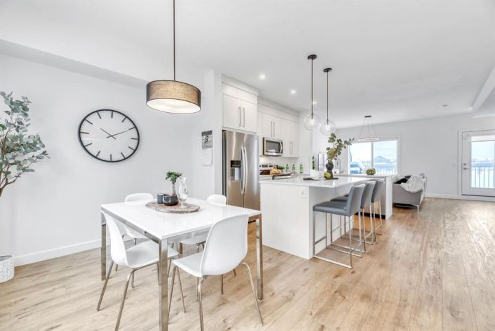 Upstairs, you’ll find an impressively open and airy layout with a massive kitchen offering abundant counter space, pantry storage, stainless steel appliances, and extensive cabinetry. The large island is perfect for cooking, entertaining, and everyday living. The dining and living areas flow seamlessly together, enhanced by a neutral designer palette and beautiful natural light.