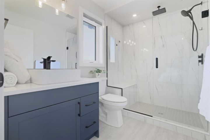 Upstairs, a bright bonus room offers flexible living space, while the luxury primary suite features a generous walk-in closet and a custom ensuite with a fully tiled shower, rain head, and frameless glass door, a true retreat.
