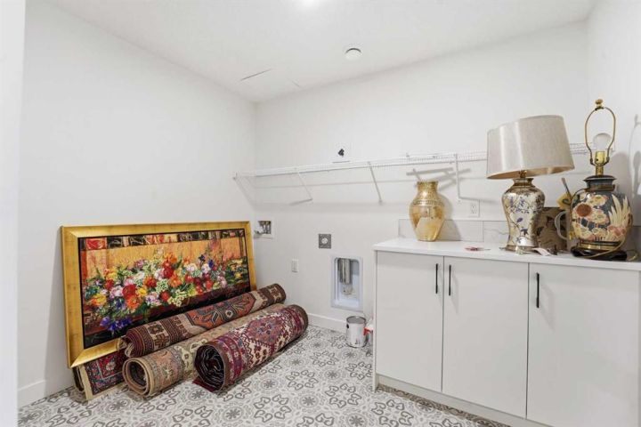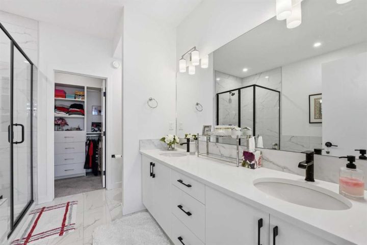 Tucked just beyond, the primary suite offers a calming escape featuring a spa-inspired ensuite with dual sinks, a standalone glass shower, an oversized soaking tub, and a generous walk-in closet. A main-floor laundry area and a stylish powder room add everyday convenience.
