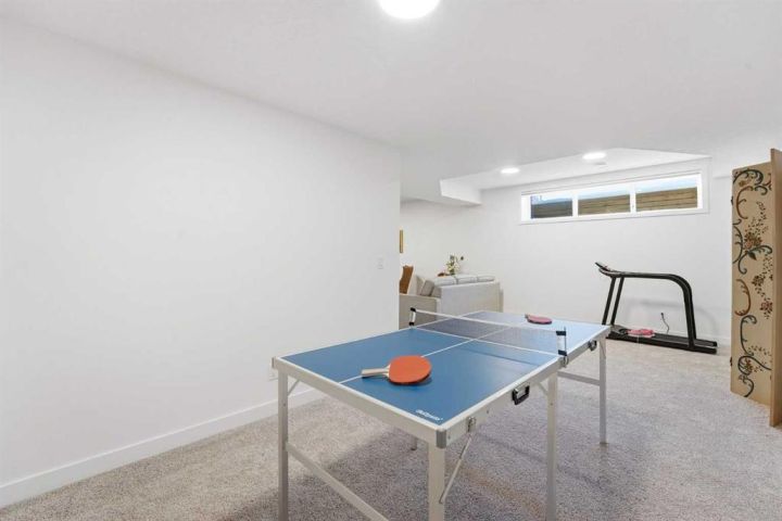 Downstairs, the fully developed basement extends the home’s versatility. The expansive recreation area is perfect for both relaxation and entertainment—currently set up with a ping pong table and treadmill, making it an inviting space for family fun. This level also includes two comfortable bedrooms, a full bathroom, a second laundry room repurposed as storage, plus additional under-stair storage.