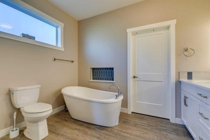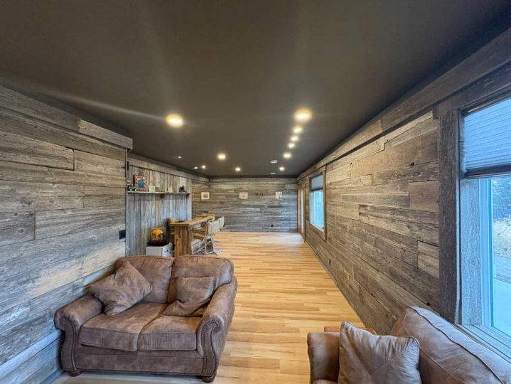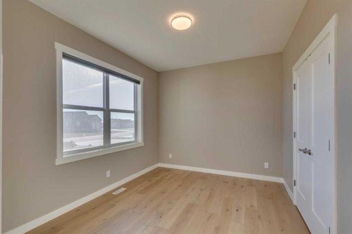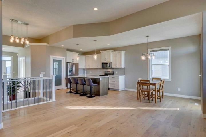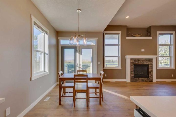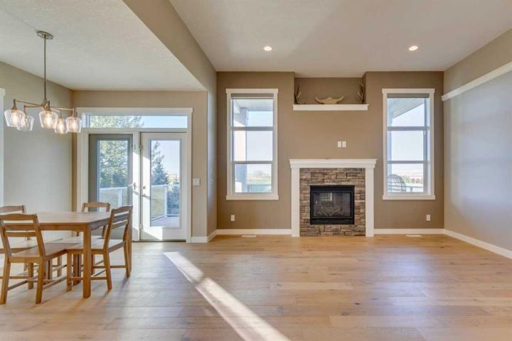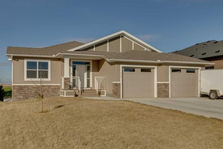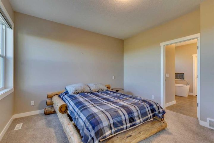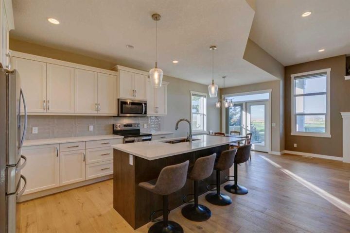 Beautifully maintained walk-out bungalow located in a quiet cul-de-sac in Speargrass, backing onto the golf course with mountain and sunset views. The kitchen features a walk-in pantry, modern cabinetry with under-cabinet lighting, quartz countertops, and a large centre island that opens to a covered outdoor living space. The primary bedroom includes a five-piece ensuite with soaking tub, wall niche, separate shower, dual sinks with backlit mirrors, and a walk-in closet with automatic lighting and direct access to the laundry room. A second bedroom, which can also serve as a home office, is located on this level along with a guest bathroom and access to the oversized 25x24 double garage. The Walk-Out Basement finished in 2024 features an additional bedroom, another full bath with 3 person steam room, gym, bar/area and storage with potential for a 4th bedroom development. Exterior highlights include an extended driveway and the opportunity to landscape the backyard to your preference. Additional features include central air conditioning and automated window blinds on remote. Conveniently located approximately 40 minutes from Calgary’s South Health Campus, this home combines comfort, functionality, and a scenic setting.