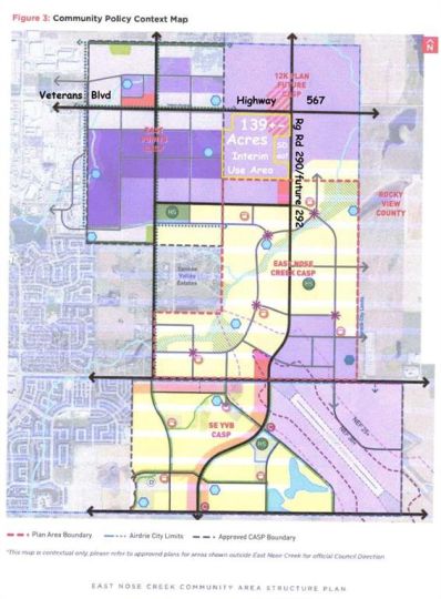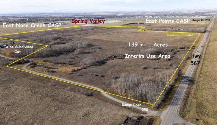 139+- Acres inside AIRDRIE, Alberta fronting on Highway 567 and within City of Airdrie Interim Use Policy Area. Located immediately north of the East Nose Creek Community ASP and immediately east of the East Points Industrial Community ASP. Excellent current opportunity for Interim business uses (by permit) and excellent future development potential. Great high visibility location with 1,900 feet fronting Highway 567 (Veterans Boulevard) and bordered on the east by Range Road 290 (future Rg Rd 292 alignment). Sale is SUBJECT TO City approval of the Landowner completing subdivision of a 10+- acre homesite and issuance and registration of new titles for the properties. GST may apply.