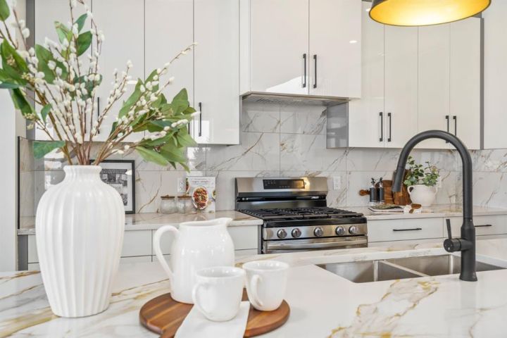 The open-concept main level features 9-ft ceilings and upgraded 9-inch luxury vinyl plank flooring. The chef’s kitchen is anchored by a 9-ft quartz island with a built-in stainless-steel microwave and dishwasher, complemented by a gas stove with hood fan, stainless-steel fridge with water hookup, undermount sink, quartz counters, and soft-close cabinetry with black hardware. Six-foot windows fill the space with natural light, highlighting the floor-to-ceiling tiled gas fireplace in the living room. The covered upper deck with glass railings and a gas line extends the living space year-round.