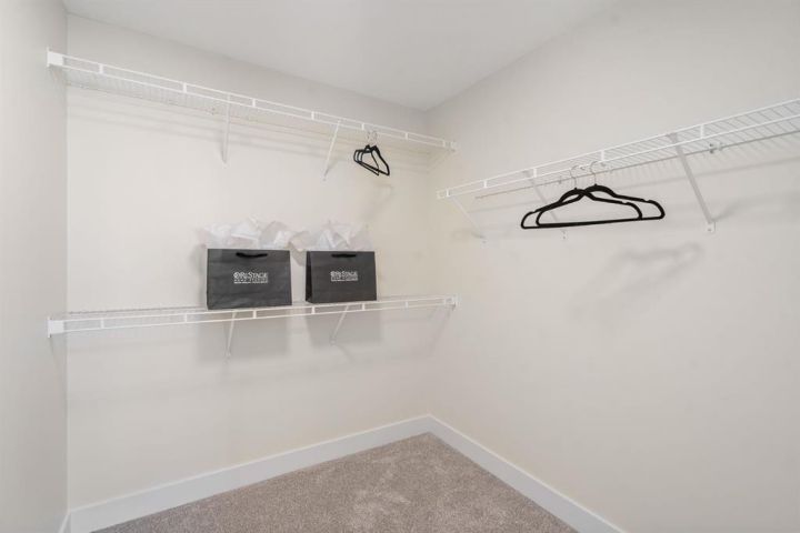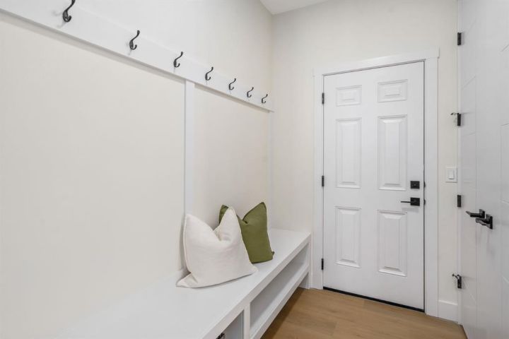 A custom walk-through pantry with built-in shelving leads to the mudroom, complete with a built-in shoe rack, coat hooks, and full closet—perfect for busy families. Direct access to the oversized double garage, with a gas line rough-in and side entrance, makes winter days and grocery runs effortless.