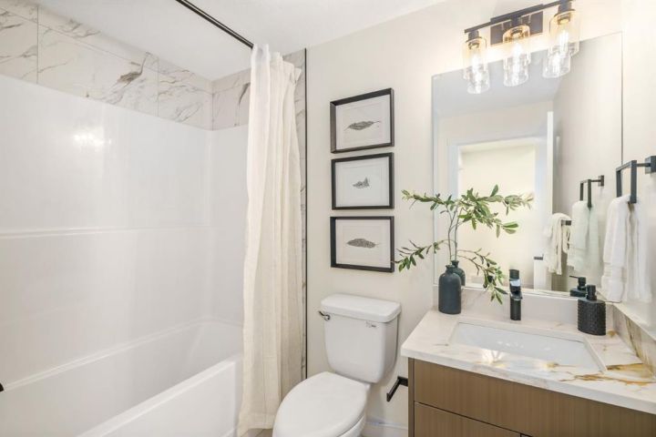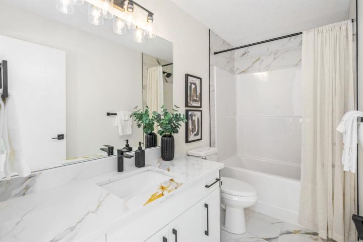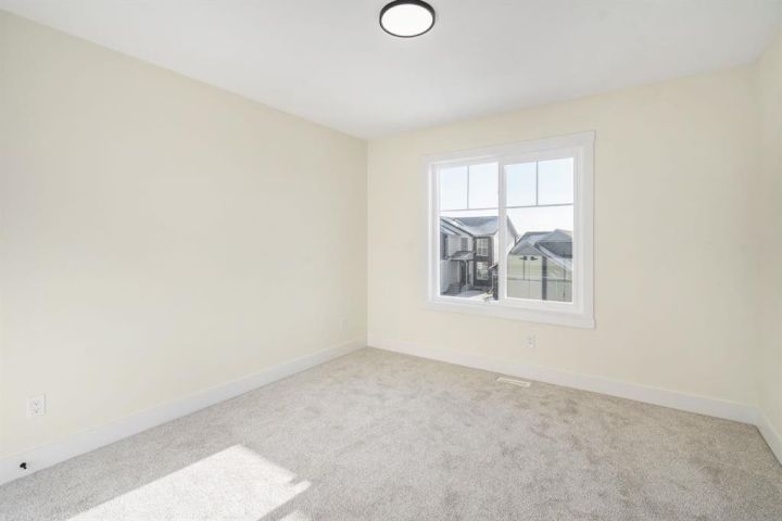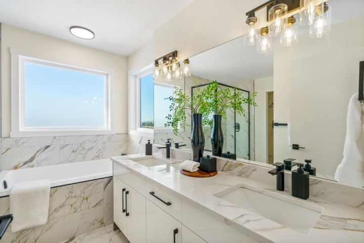 Upstairs, a vaulted bonus room offers a bright, inviting family retreat. The upper laundry room includes tile flooring and a quartz folding counter. The serene primary suite features large windows and a spa-inspired ensuite with a dual quartz vanity, soaking tub, fully tiled shower, separate toilet room, and walk-in closet. Two additional spacious bedrooms—one with a walk-in—share a beautifully finished four-piece bathroom.