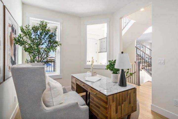 From the moment you arrive, the stone-accented exterior and architectural detailing set an elevated tone. Step through the custom glass-insert door into a bright vaulted foyer with an 8-ft closet and open sightlines that introduce the home’s modern, elegant design. A main-floor office with oversized windows provides an ideal workspace.