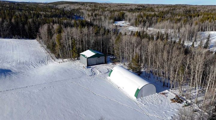 Additional structures include a 24' x 40' insulated four-car garage with radiant heat and two 17' x 8' overhead doors, a 36' x 70' canvas quonset with gravel floor ideal for farm equipment or trucks, and a smaller 19' x 40' insulated wooden barn with propane radiant heat and a wooden floor. There is also a two-sided steel hay shed measuring 50’ x 40’ x 20’ in height.