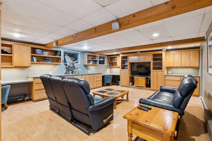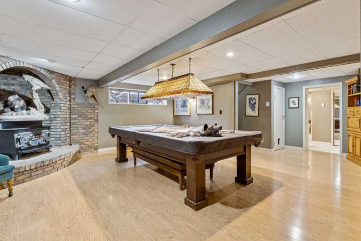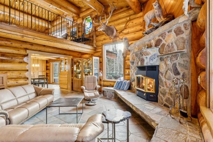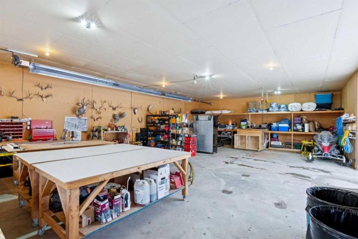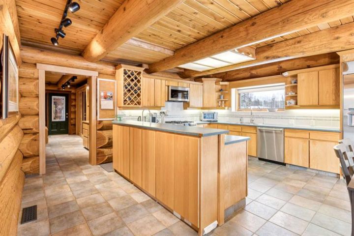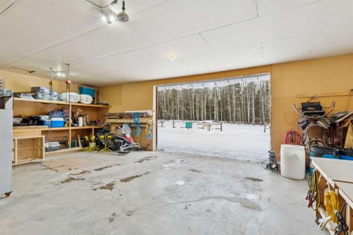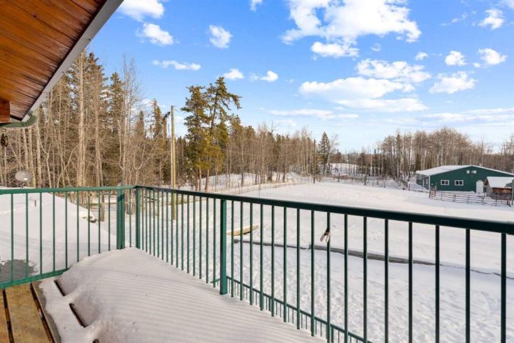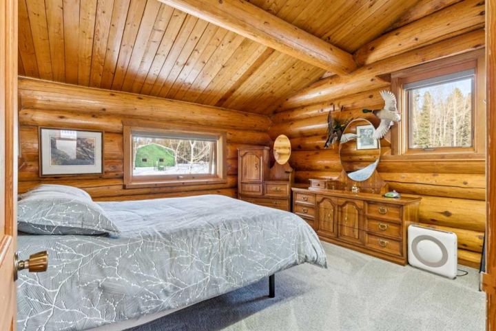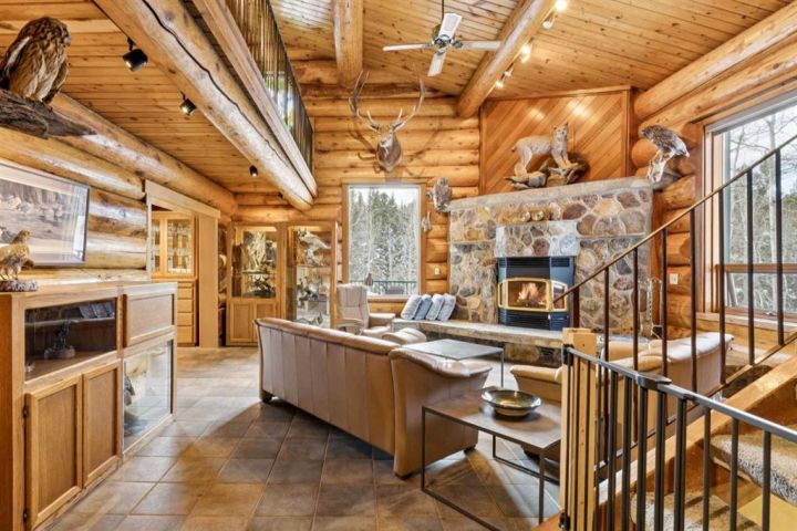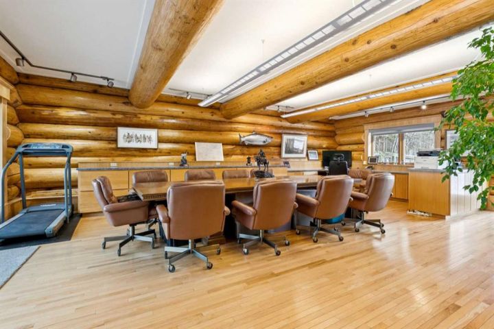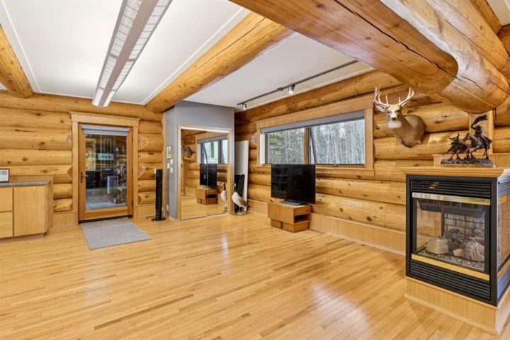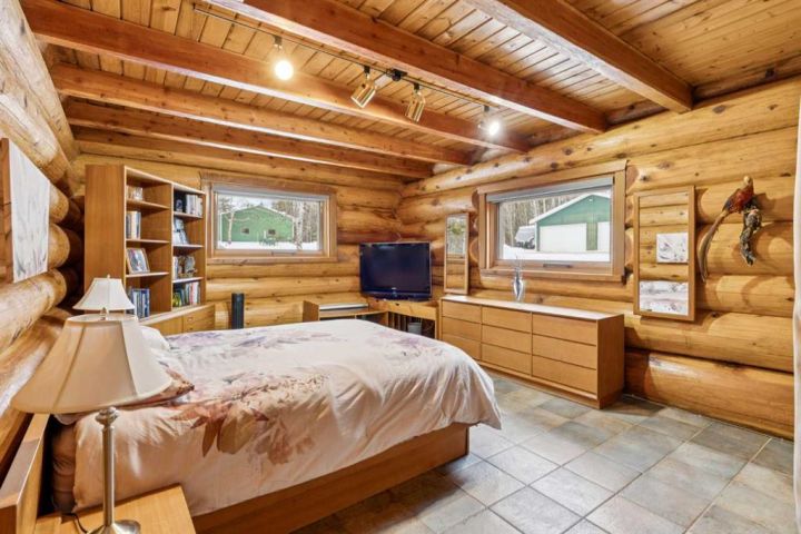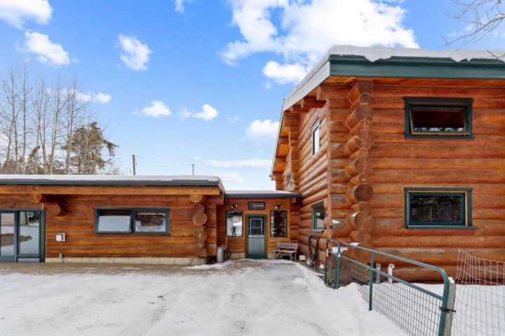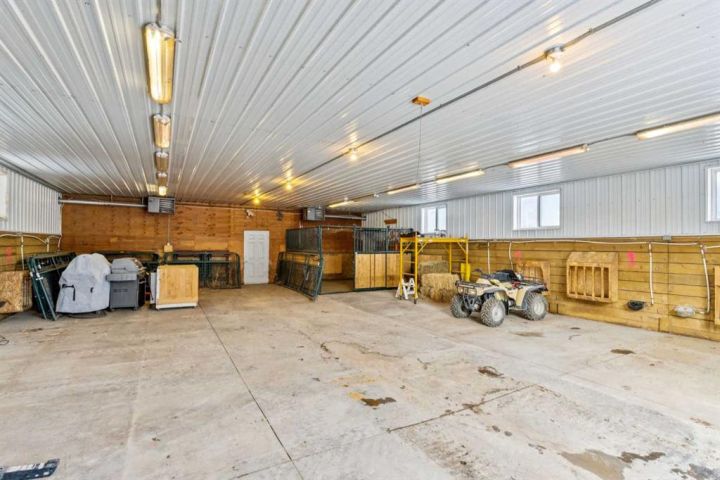 The 5,900 sq ft cedar log home was built in 1981, with a full basement renovation completed in 2004. A comprehensive renovation of the upper two floors and the large office followed in 2009–2010, leaving the home warm, bright, and exceptionally inviting. Towering south-facing windows fill the main living area with natural light, while the stone wood-burning fireplace creates a cozy focal point. The spacious office/boardroom has heated hardwood floors and a gas fireplace. The main body of the house features in-floor heated tile and new carpeting. Both the house and the office have built-in custom cabinetry throughout. The home offers four bedrooms, including a master suite with ensuite and a private balcony overlooking the barn and farmyard. A large 30' x 40' home office (or potential recreation room) provides excellent versatility. Additional features include a generous mudroom, a 3-piece main bathroom, a powder room and ensuite upstairs, and a luxurious basement bathroom with a jet tub. The home is serviced by a private 90' well with iron filter and softener, septic tank with field, natural gas, and 100-amp electrical service.