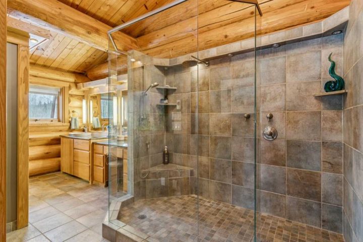Decks and balconies overlook the farmyard and Big Prairie Creek, offering peaceful views in every season. The cement foundation and quality cedar log construction provide durability, while interior updates maintain modern convenience without compromising the home’s timeless character.
